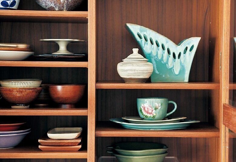 食器棚の中央には、大好きな花瓶や食器を飾るように収納して見た目を楽しみます。「家事や育児に追われて部屋がゴチャ~っとしてもここを見ればご機嫌に」。