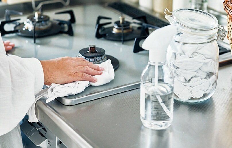 ガスコンロや水回りの汚れが目立ってきたら、ウエスと電解水クリーナーでサッと拭き掃除。「汚れたふきんを洗って漂白するのなんてムリ!だから、ウエスを瓶にストックして使い捨てにしています」。