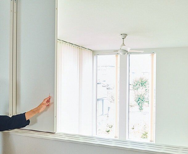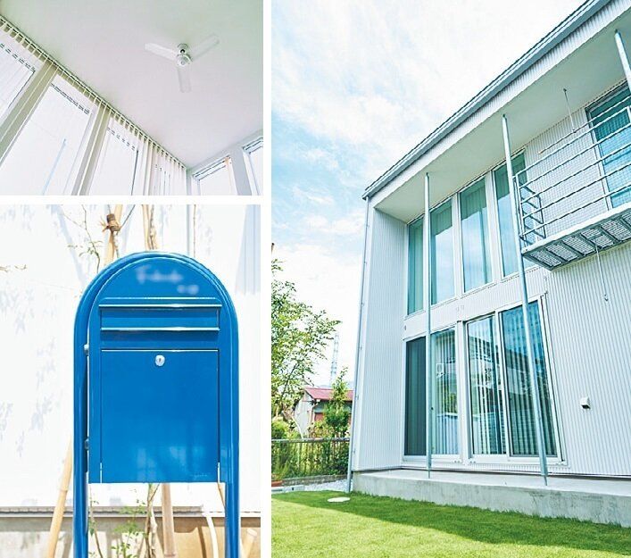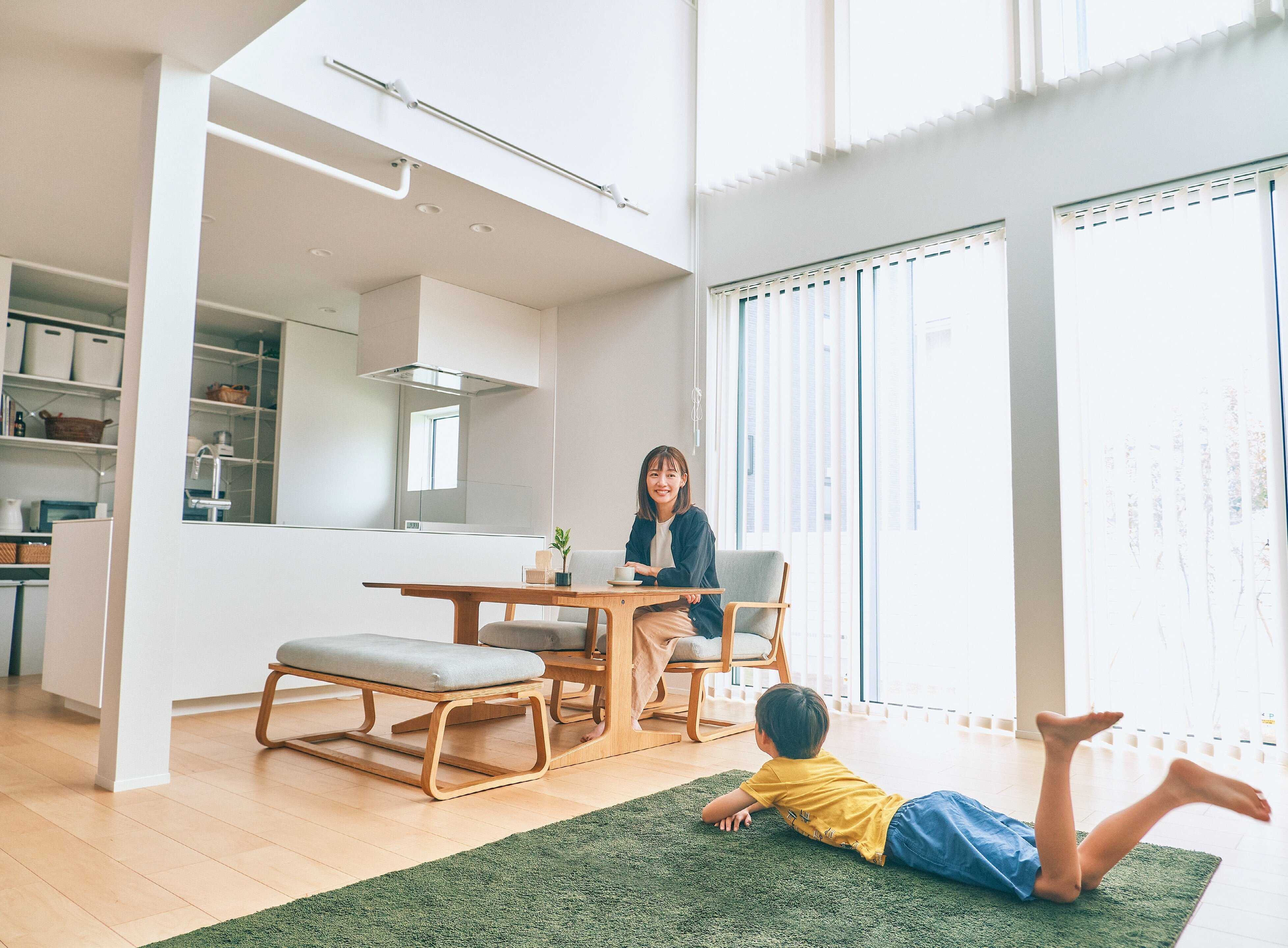 ちかママさんの住まいは無印良品の「木の家」。シンプルな外観と吹き抜けいっぱいに広がる大きな窓が特徴的。仕切りが少ないオープンな空間も特徴の1つ。