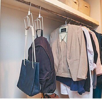 S字フックよりも安定感があるので、よく使用するバッグの収納にはネクタイハンガーを活用。つるせば余白に効率的に物をしまえます。