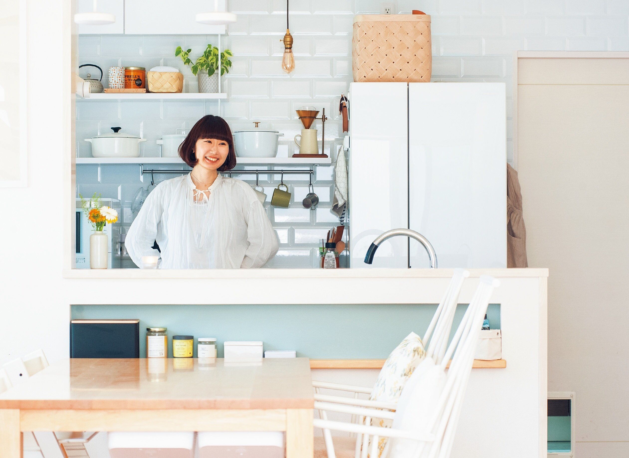 「結婚当初は料理に3時間もかかっていたんです」と笑うおさよさん。料理も家事も苦手だったけど、スムーズにできるよう収納を工夫したおかげで、今では調理時間が30分に!「いちいち、どこにあるんだっけ、どうするんだっけと考える時間もストレスも減って、家族の手伝いも増えたんです」といいことずくめ。目からウロコの収納グッズ使いが光る工夫満載のキッチンは、居心地がよく、ハッピー感につながる起点になっているようです。
