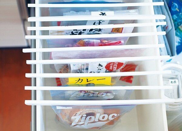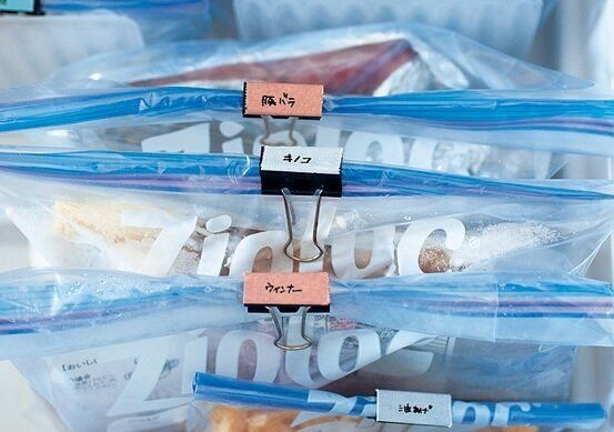 下ごしらえした食材を保存袋に入れて冷凍。冷凍室を引き出したときすぐにわかるよう、ダブルクリップをラベル代わりに。何がどれだけあるかが明確で、買い物前のチェックも簡単。