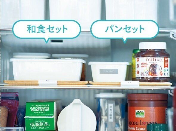 冷蔵室には、朝食に使う物をトレーにまとめてセット。「和食セット」にはのりや梅干しなどご飯のお供が、「パンセット」にはバターやジャムがスタンバイ。これだけでも朝のバタバタが減。