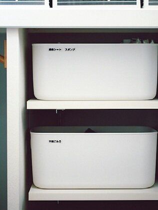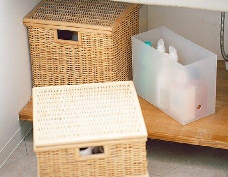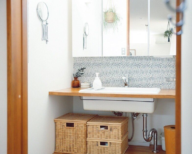 洗面台下に置いたかごには、ドライヤーなどのヘアケアグッズを。その後ろに、洗剤やシャンプーのストックを入れたファイルケースを隠しています。ストックは1種類1品までに。