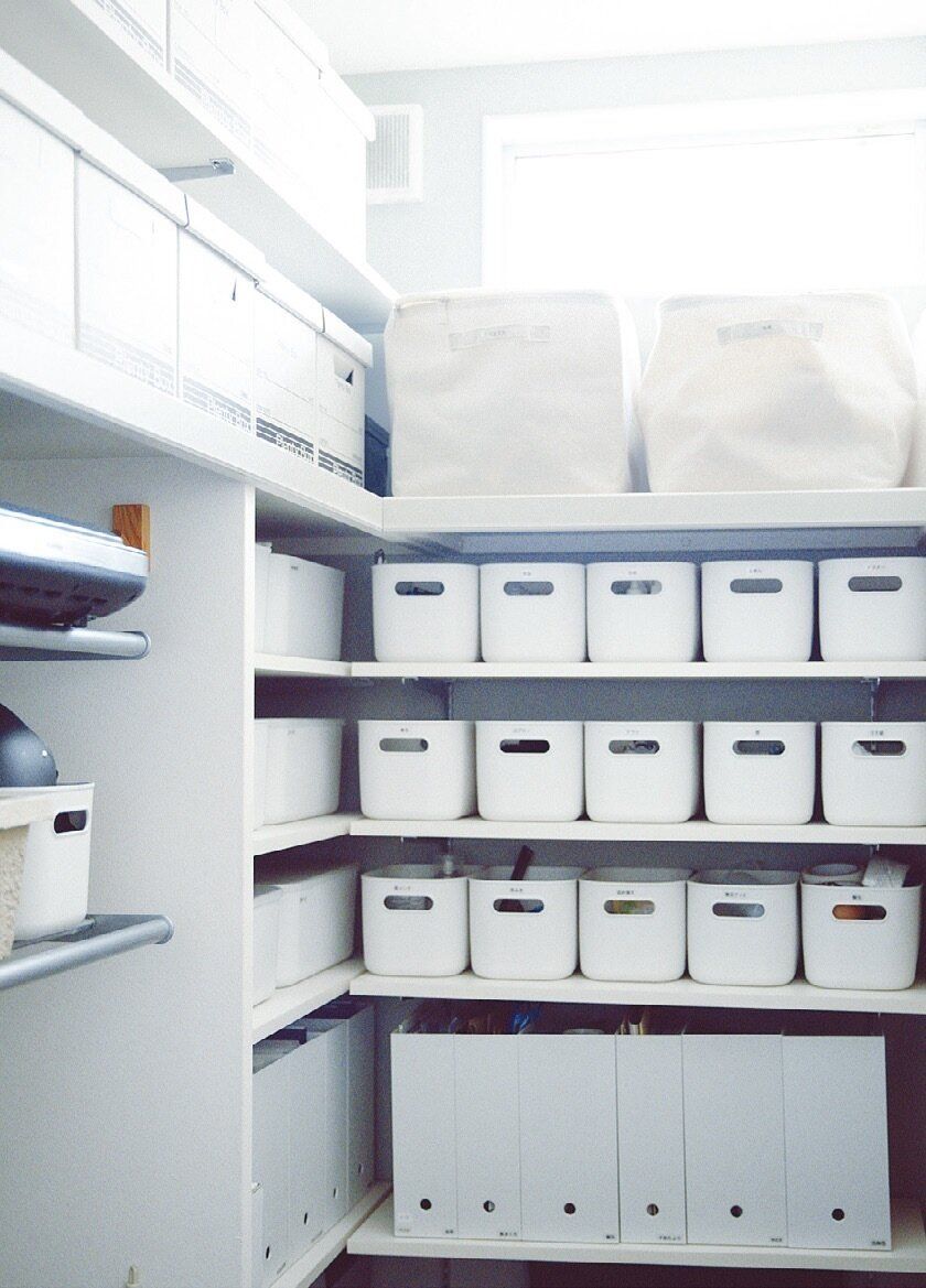 玄関から土間続きの収納庫。「種類ごとに箱やソフトケースに分け、ラベリングで中身がすぐにわかるように。ケースに収まらなくなったら、捨てる物がないかチェックします」。