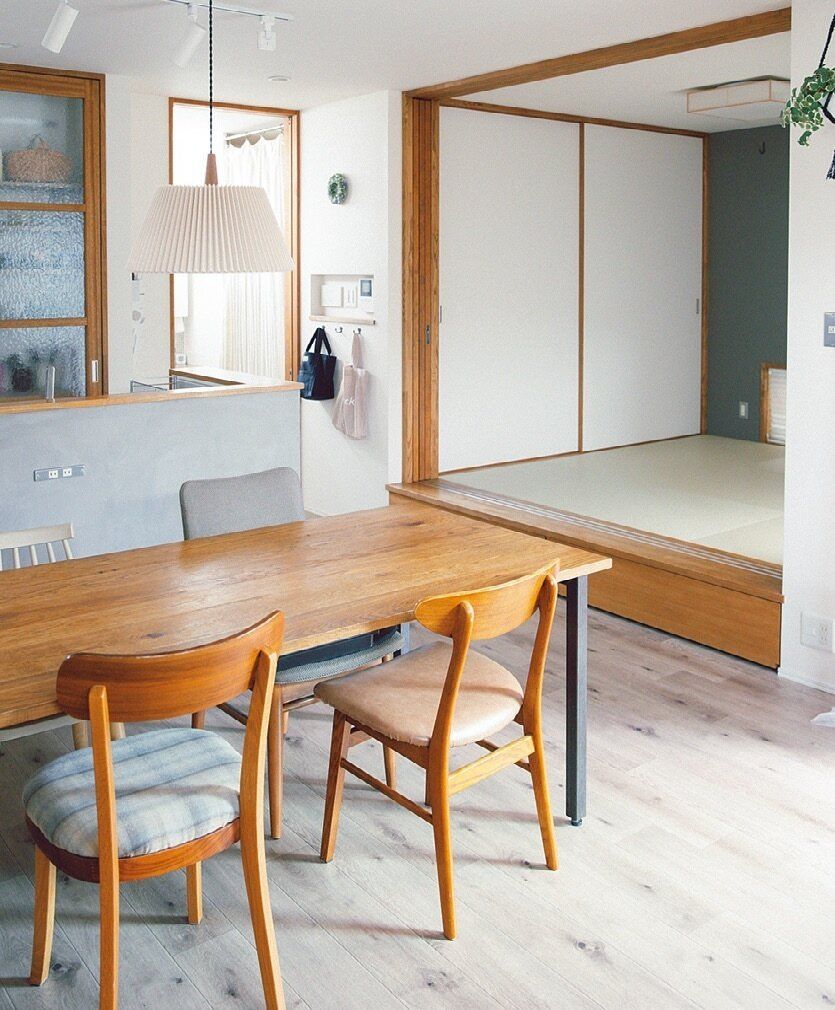 1階に持ち込んだ物は、寝る前にリセットするのが決まり。「書類などを片づける気力がないときは、和室の押し入れに仮置きを。テーブル上に何も置かないことを徹底しています」。