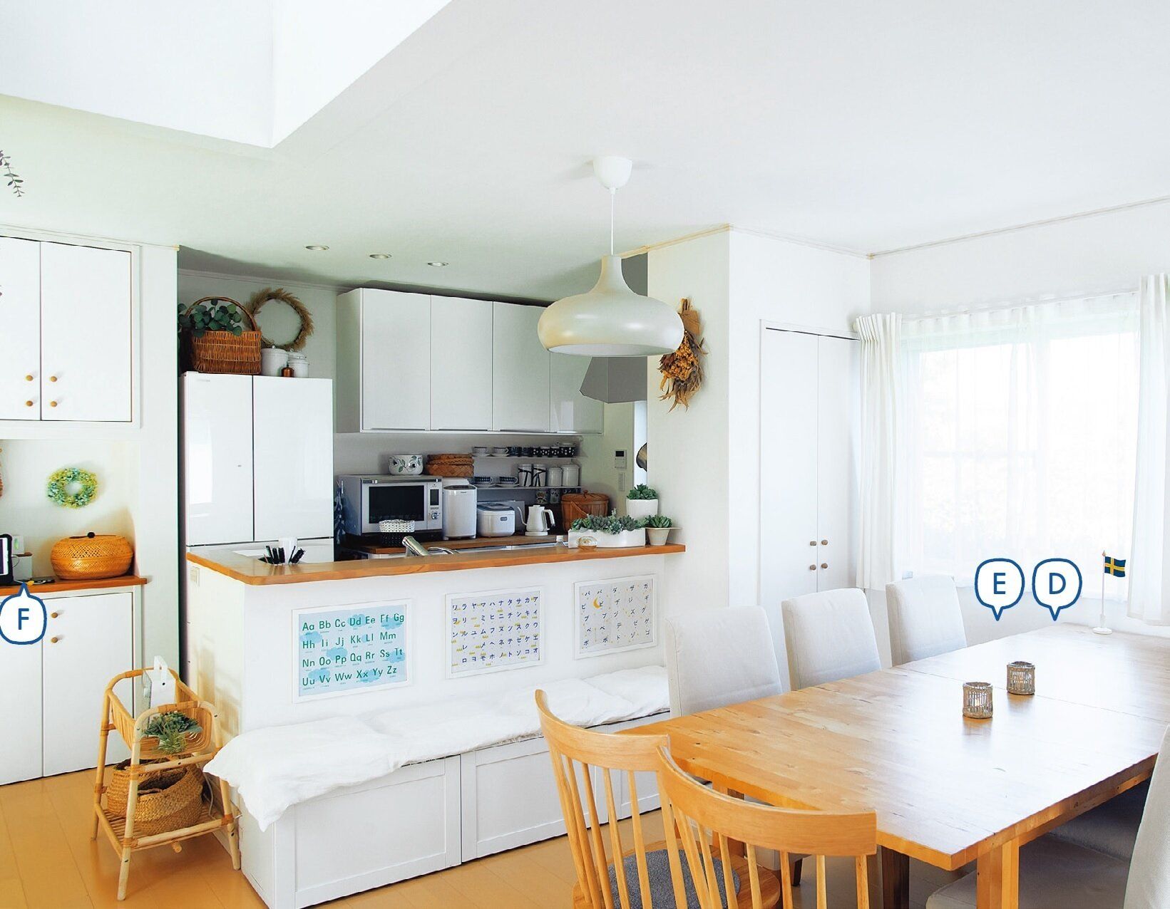 インテリアは白と自然素材がメイン。キッチンにはパントリーもなく、収納は少ない。