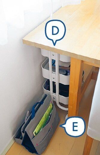 定番の3段ワゴンは、テーブルの下に。ちょい置きしがちな物は、ワゴンに投げ込めば、すっきり!
