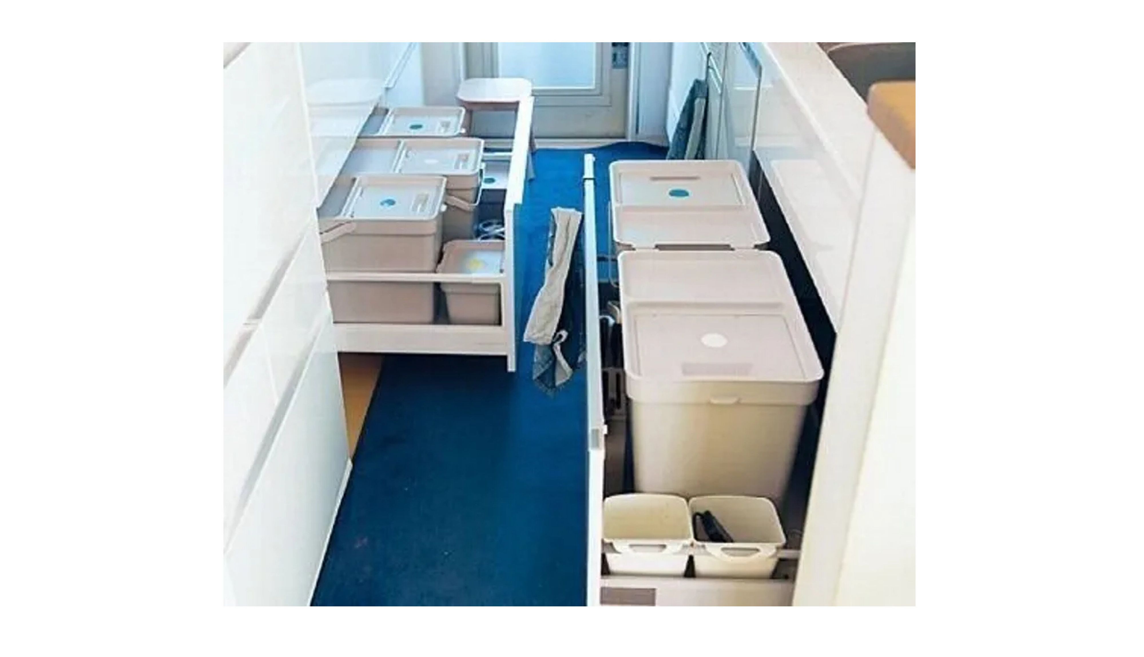 「北欧の家庭では、キッチンのごみ箱は引き出し内にしまうのが一般的。清潔感があっていいなと思い、マネしました。ちなみに、部屋ごとにごみ箱を置いていないのも北欧流です」。