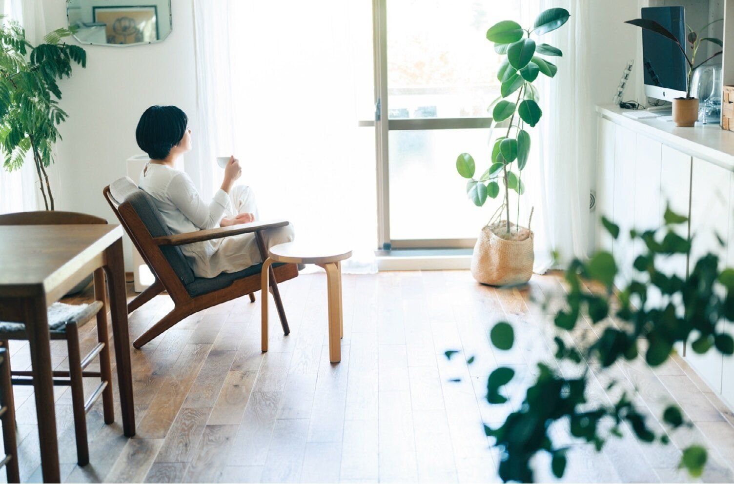 「小物が散らかっていてもサッと片づけられるので、床が広く使えます。1人掛けソファに座って、庭を眺めるのが至福のとき!」。