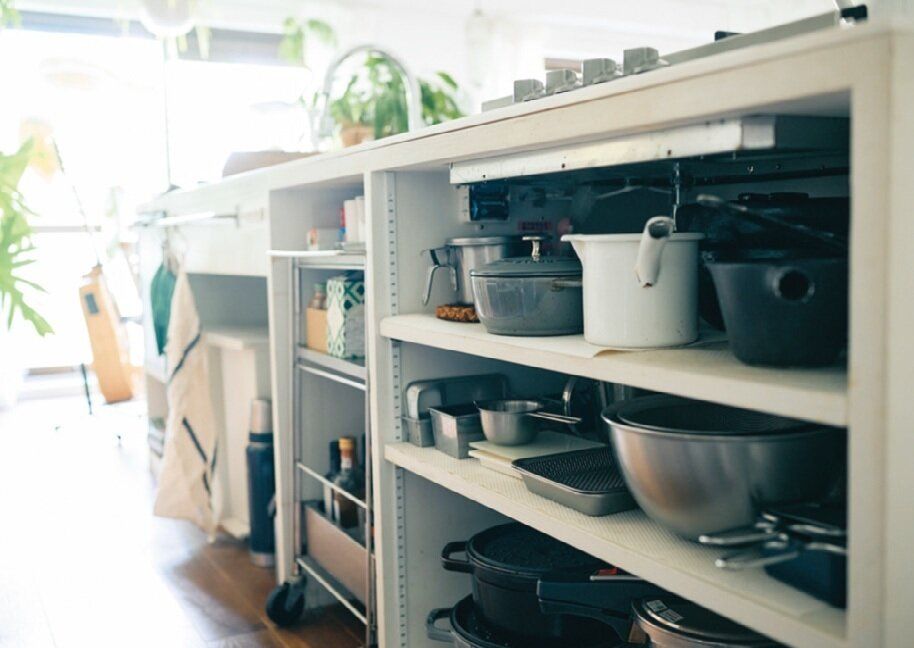 キッチンカウンターの下は扉なしの棚に。「扉の開け閉めがないから、ぬれた手のままでも鍋や調理器具が出せて便利です」。