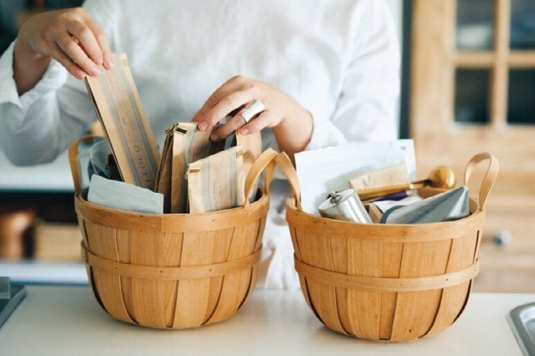 薄い木で編んだかごに、それぞれお茶とコーヒーセットを収納。オープン棚の下段にそのまま置いても、雰囲気がまとまりやすく、取り出すのもラク!