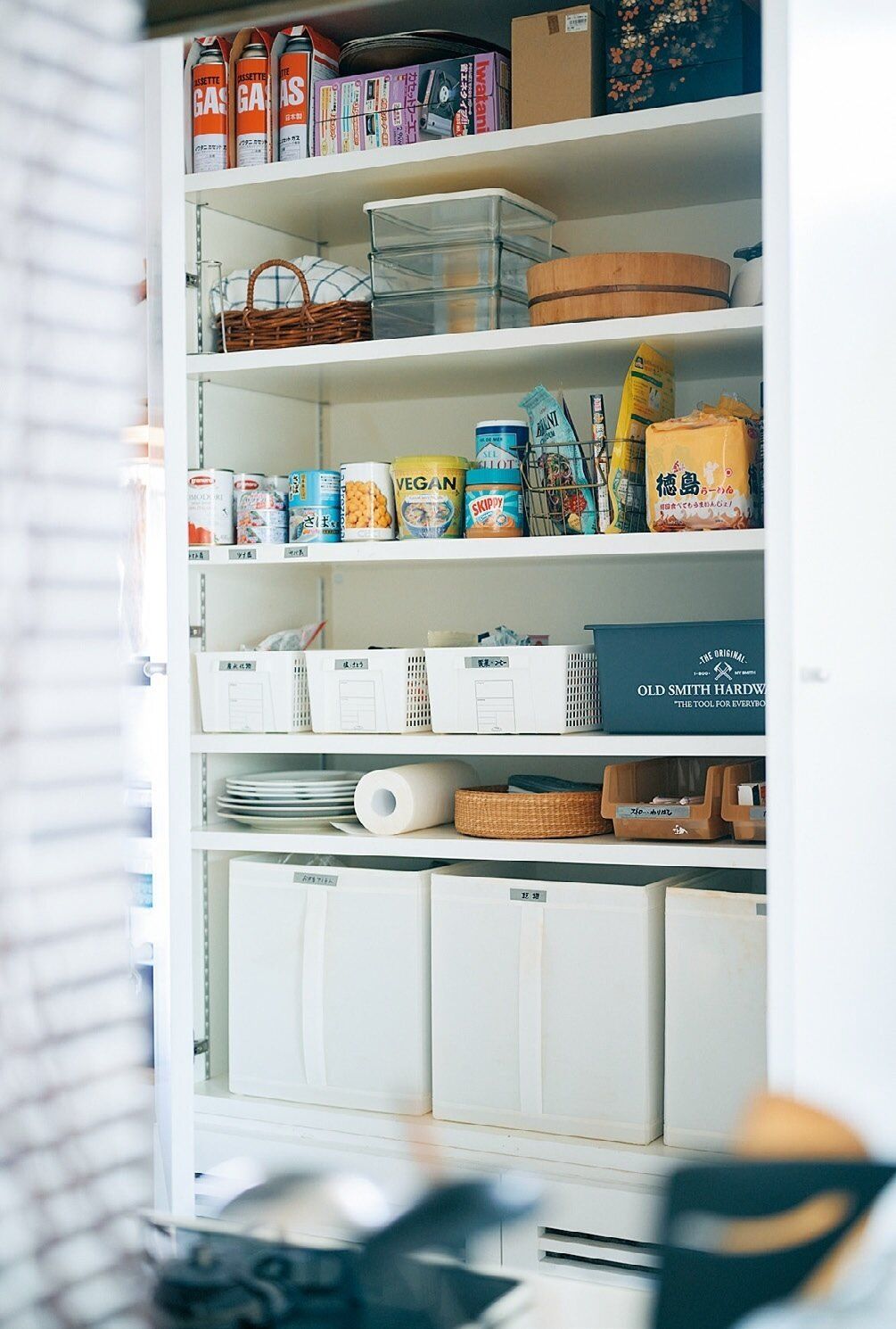 なんでもカゴやケースに入れると母がわからなくなるので、未開封のストックは“まんま置くだけ収納”。よく使う物の収納にはマステで名前を。わかりやすさがいちばん大事です。