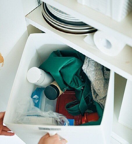 形も大きさもまちまちなべんとう箱や水筒、保冷バッグなどのべんとう関連グッズは、大きな収納ボックスにひとまとめ。べんとう関連しか入れないと決めたら、あとはポイポイ突っ込む。