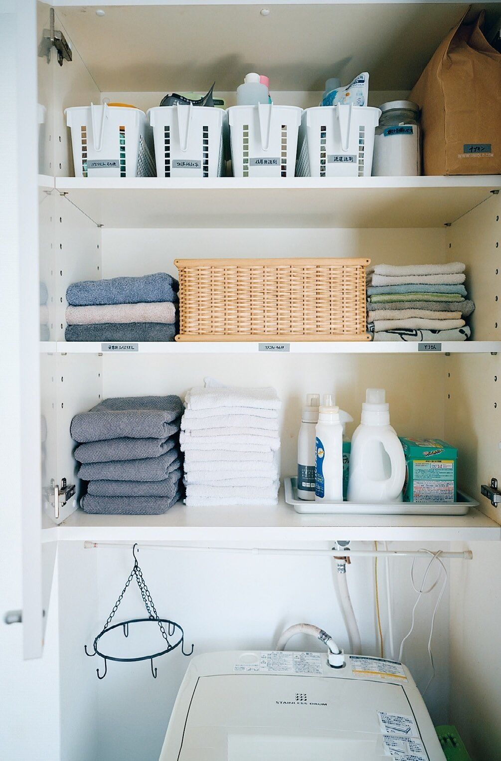 最上段の収納ケースは、踏み台を使わなくてもさっと手が届く取っ手つき。「洗剤、シャンプーなど、マステで名前をつけておけば、中身が見えなくても目的の物がすぐ取れます」。