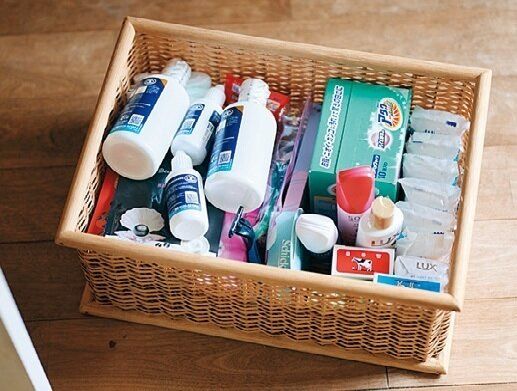 アメニティーグッズは小さい物も多いから、カゴは大きくても深すぎない物を。上から見たときどこに何があるかすぐわかる。中は仕切らず、ざっくりおおらかに使う。