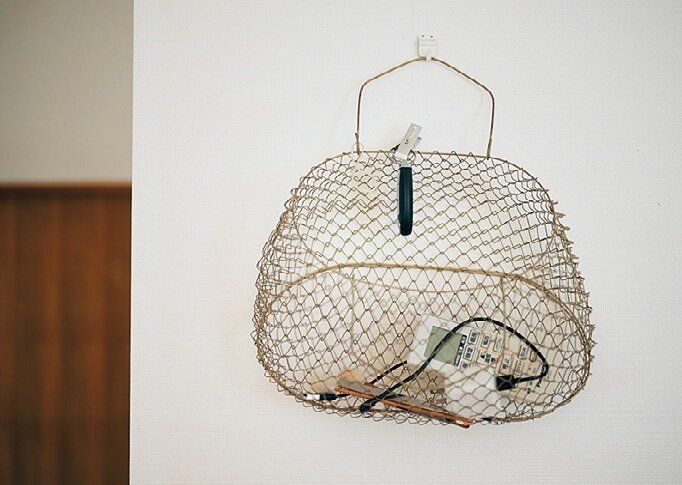 ひとり暮らしの娘が泊まりにきたときなど、急に「あれどこ?」と聞かれがちな物は、リビングからもダイニングからもよく見える壁にカゴを吊るし、そこに一括収納。