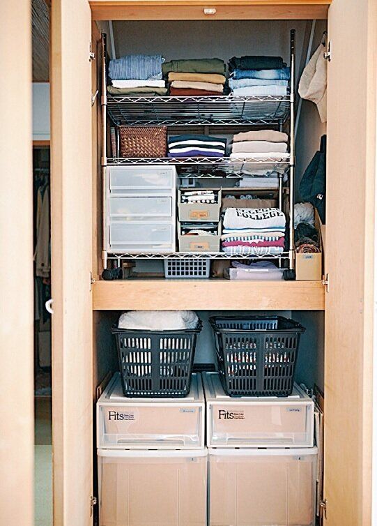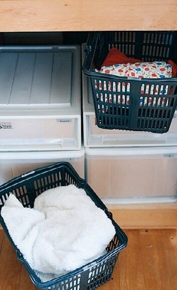 「着るたび洗うわけない!」部屋着やフリースはクローゼットの買い物カゴに突っ込むだけ。「“数回着たけど洗わない服”用の場所を作ってあげれば散らかりません」。