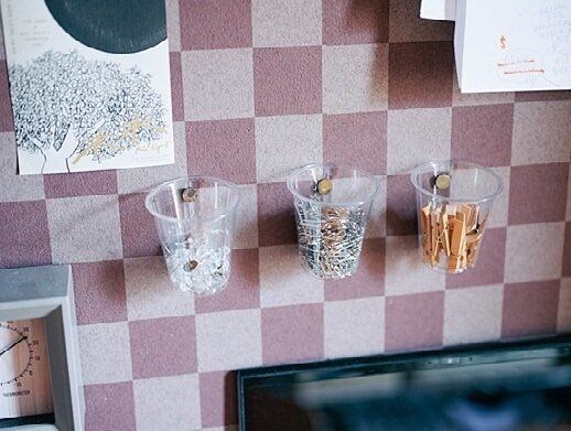 昔、画びょうと別の文具を混ぜて引き出しに入れてたら、取るとき刺さって痛かった……ので今は種類別に透明カップに入れ、壁にペタッ。「小さい物ほど分けて収納するほうが出し入れしやすいですよ」。