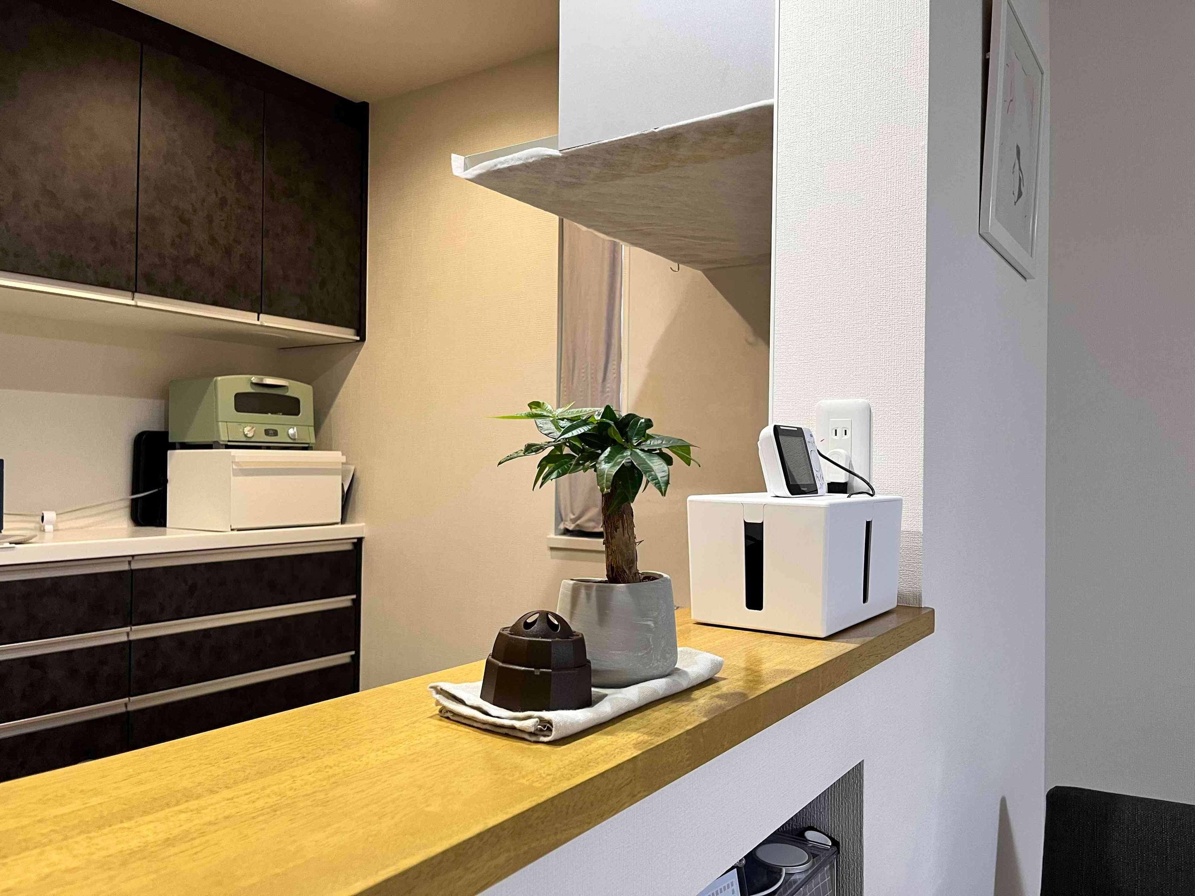 2つ目は、あえてキッチンカウンターの上にインテリアやモノを置いて、郵便物などを置けないようにすることです。キッチンカウンターの上はきれいにしたいと思いインテリアを含めて何も置いていなかったのですが、逆に普段から観葉植物などのインテリアを置くようにしました。そうすることで、意識が変わったのと、モノを置ける場所も減ったので、郵便物などを置きっぱなしにすることがぐんと減りました。