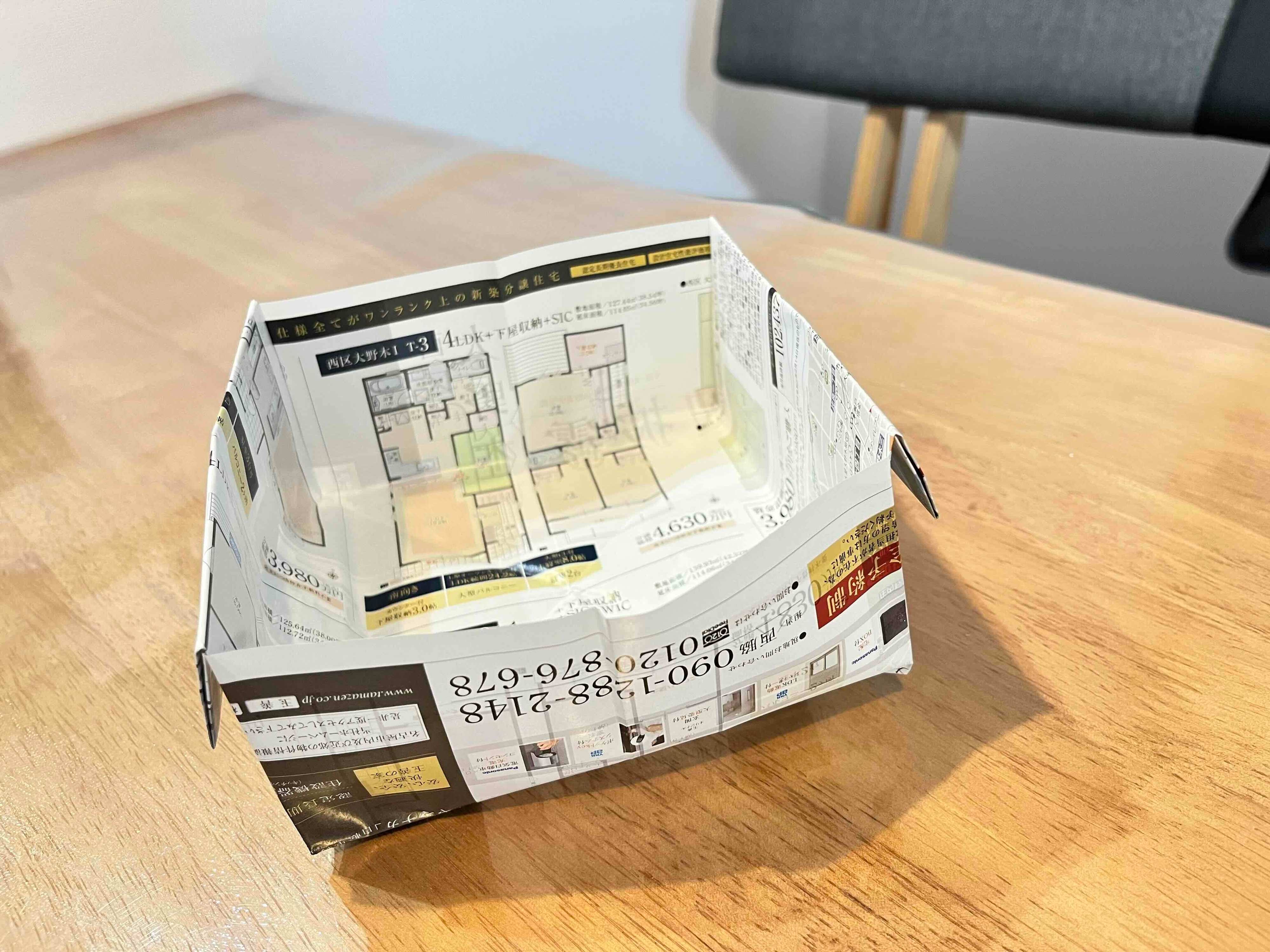 3つ目は、ダイニングテーブルの上に小さな卓上ゴミ箱を置いておくことです。郵便物の中でも、DMやチラシなど不要だとすぐに判断できるようなものは、紙で作った簡易的なゴミ箱に破って捨てることでテーブルの上が散らからなくなりました。