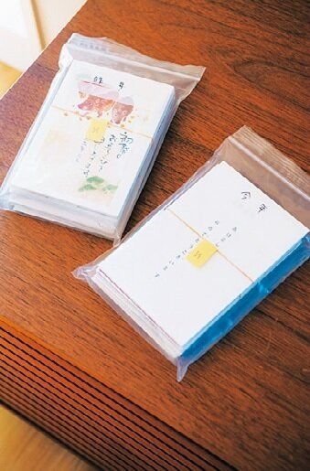 年賀状を残すのは2年分、それぞれバサッとまとめて袋へ。