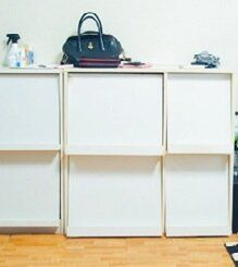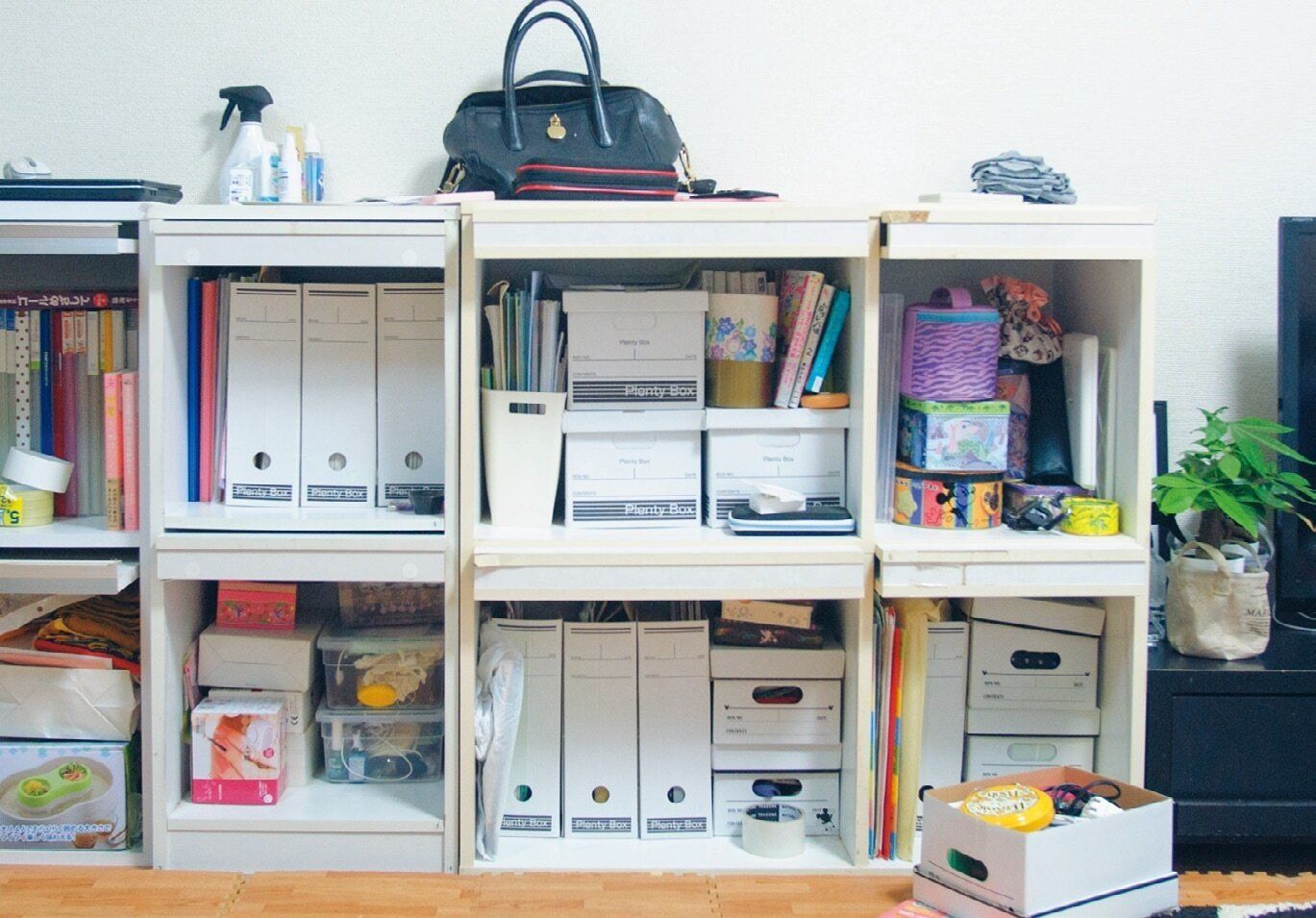 白い箱に入れればシャレオツってうちも思ってた。でも、棚の中にふたつきの箱を重ねていると、出すのが超面倒。(オギャ子さん)