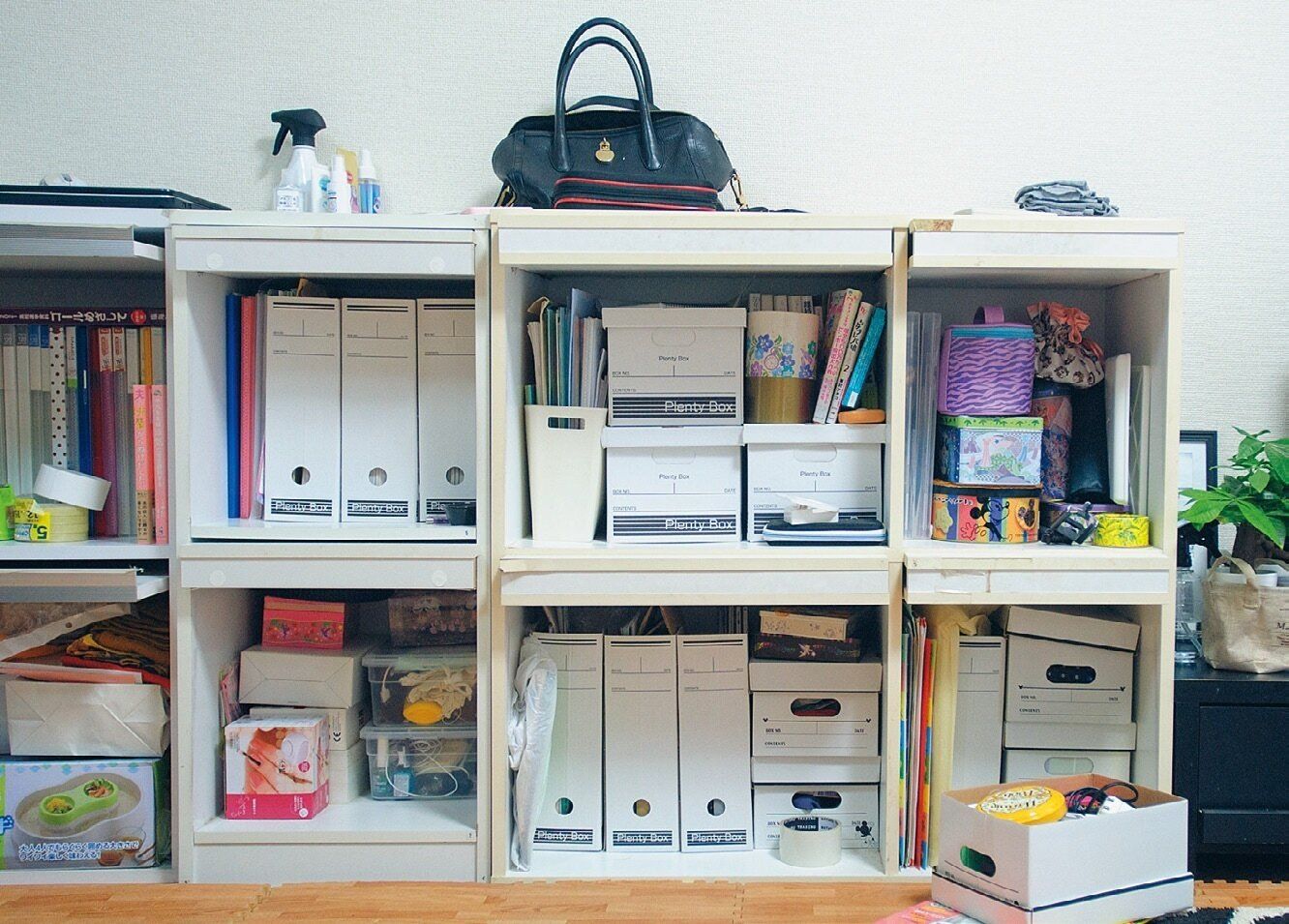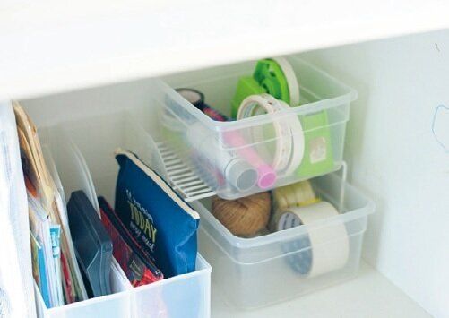 用途別に一時置き場をつくれば、棚の上は常にスッキリ。何でもBOXは浅いほうが中身がわかって管理もラク。