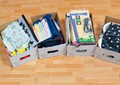 裁縫道具や懸賞応募セットなど、一応分類はしてあるけれど、ふたを開けるまで中身がわからない状態。重ねた箱をいちいち出すのも面倒。