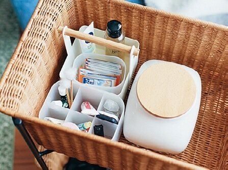 置き場所が決まっていない「家なき子」があるのが、散らかる原因。散らかりやすい場所ごとに「何でもBOX」を置いて、”ちょい置き”を阻止。