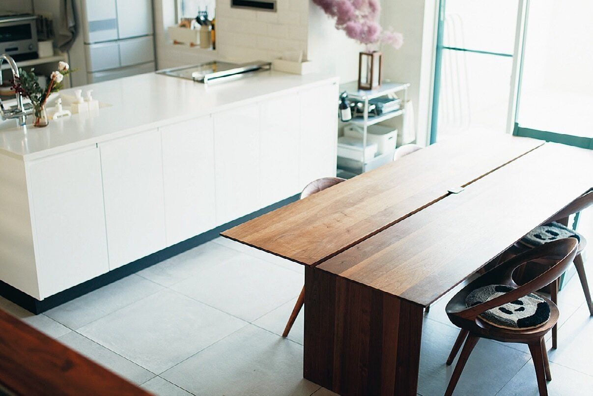 ダイニングテーブルの上に出しっ放しになりがちな物にも、すべて「帰る場所」を決めています。「すぐ手が届く場所を帰る場所にすれば、しまうのも簡単。テーブルの上はいつも広々」。