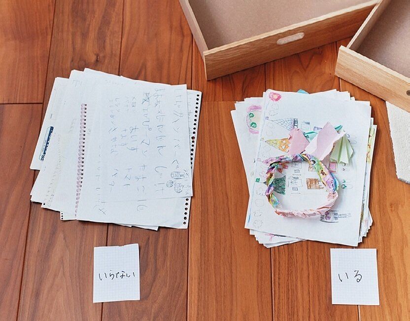 子ども用の引き出しがいっぱいになったら中身をぜんぶ出し、子ども自身にいる・いらないを決めさせます。「ぜんぶ出せばたくさんあることが一目瞭然だから、捨てる判断も早いですよ」。