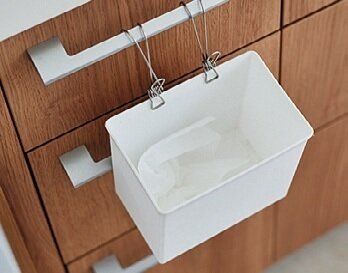 ごみ箱にしているケースは、ワイヤークリップで引き出しの取っ手に引っ掛けます。「浮かせれば、掃除機をかけるとき、どかす手間なし」。