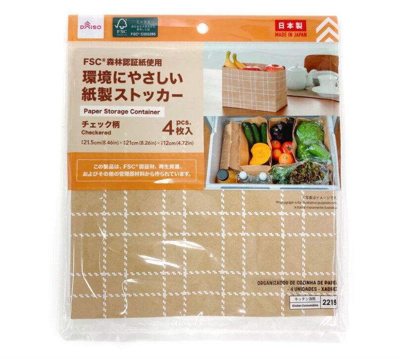 環境にやさしいFSC(R)森林認定紙を使用した、ダイソーの紙製ストッカー。おしゃれなチェック柄の紙袋が4枚入っています。厚手で丈夫なので、野菜を入れてもしっかり自立します。耐水紙を使用しているので、濡れても破れにくいのがうれしいポイント。
