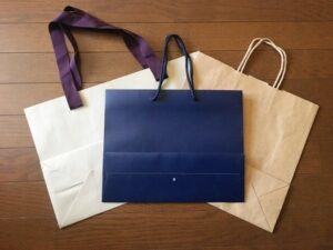 1.持ち手がついている紙袋の場合、ハサミで持ち手をカットします。