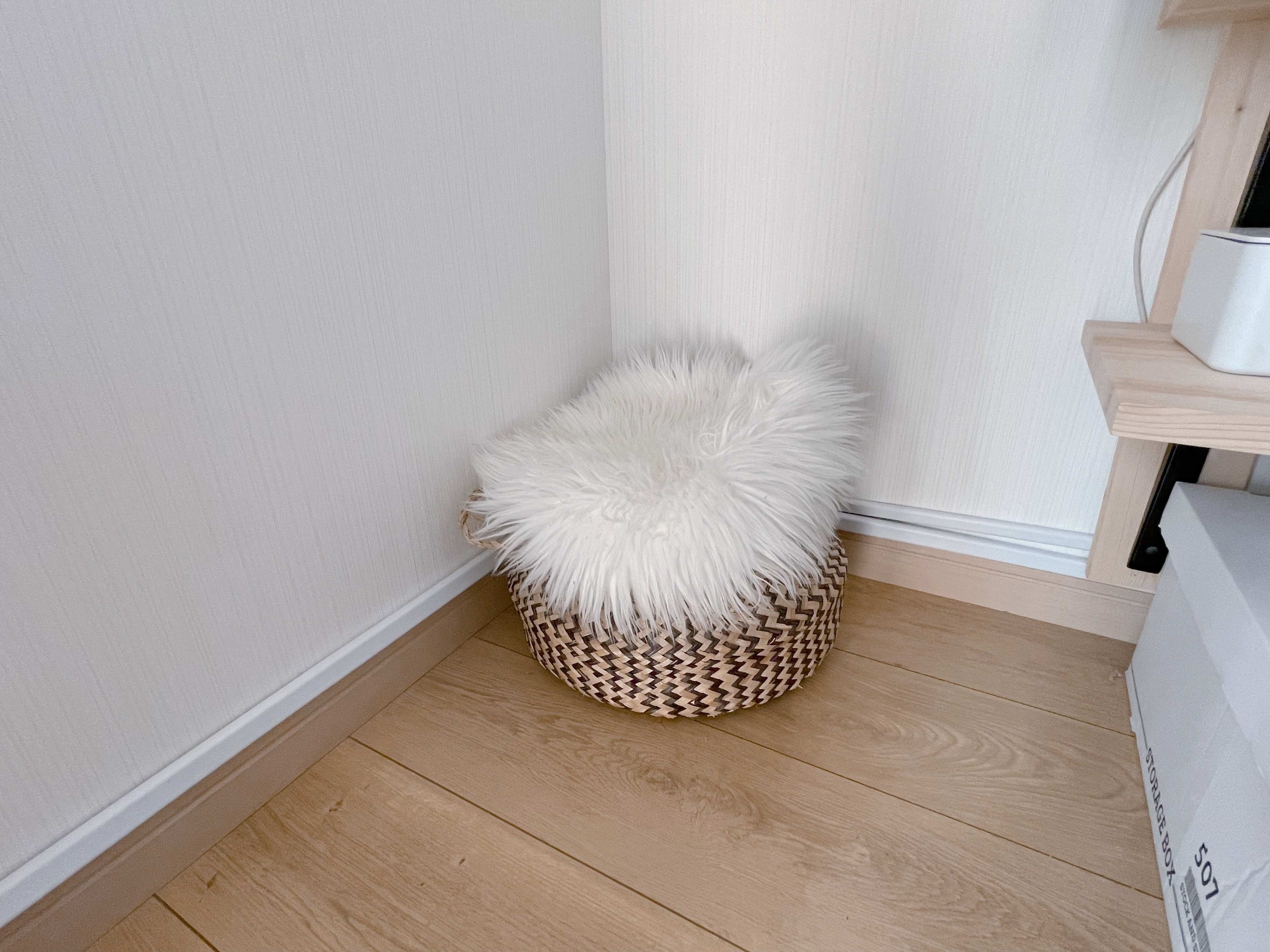 配線カバーでカバーしきれないルーターやタップ類は、カゴにまとめるだけでOK。