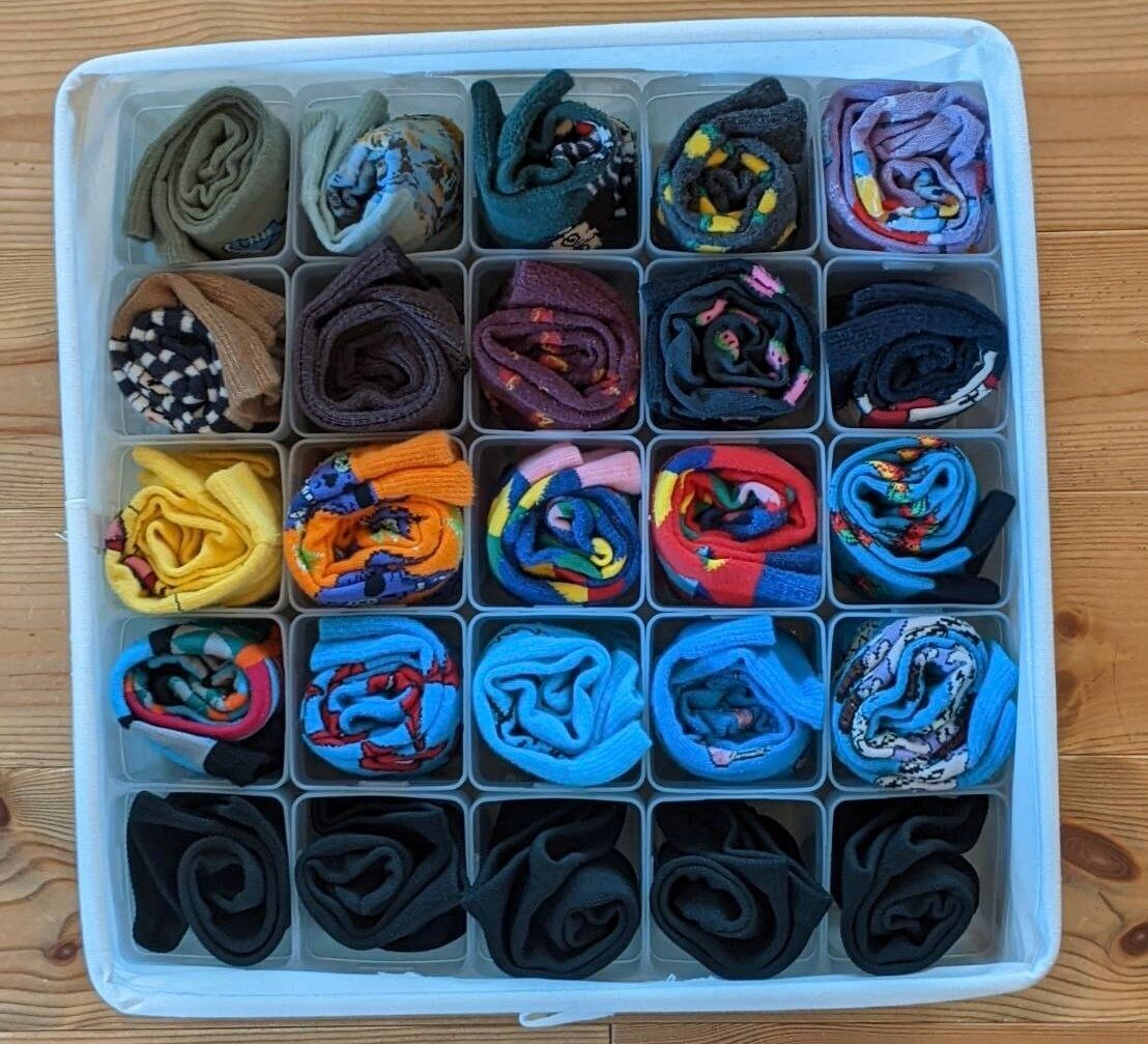 こちらはMサイズを25個使用した靴下収納例。さすがは靴下専用の収納アイテム!取り出しやすく戻しやすい、快適な収納に仕上がっています。