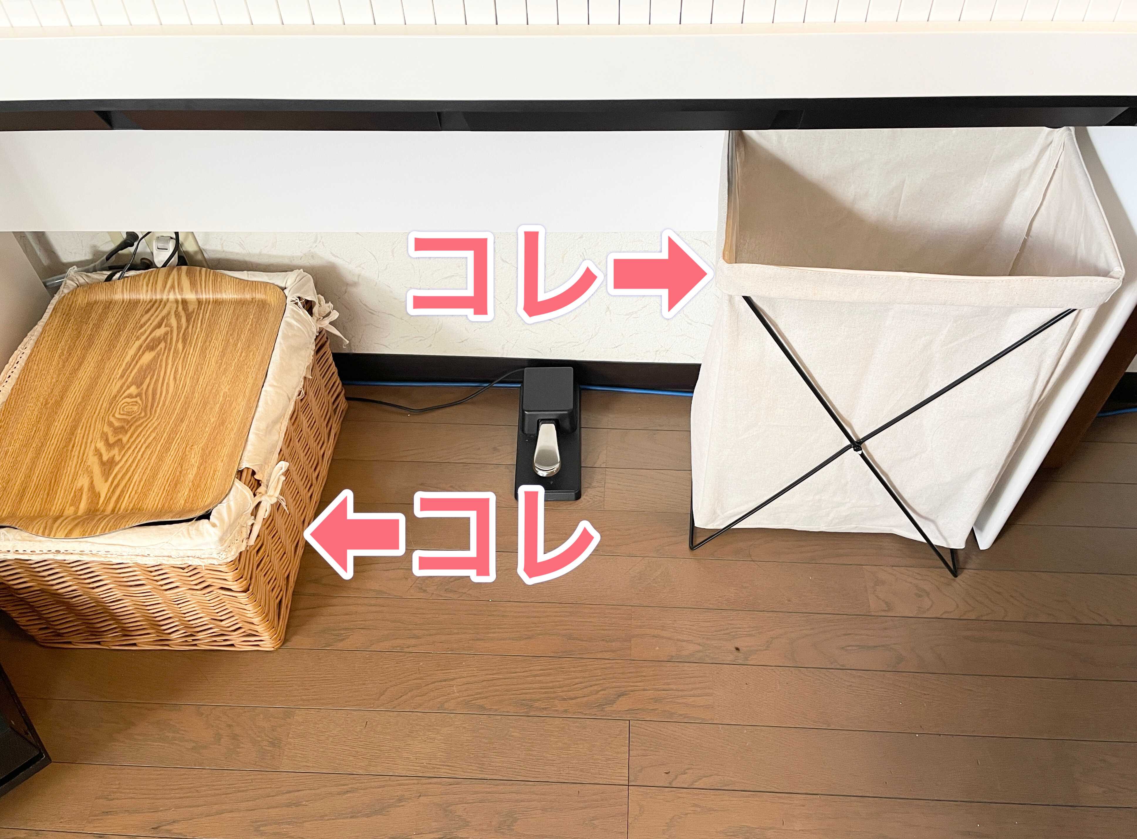 左のカゴには、コンセントとスマホ関係の充電器やテレビゲーム周辺用品を、右は普段は空ですが、夫が帰ってきたらカバンや買ってきた物を入れる用のカゴです。