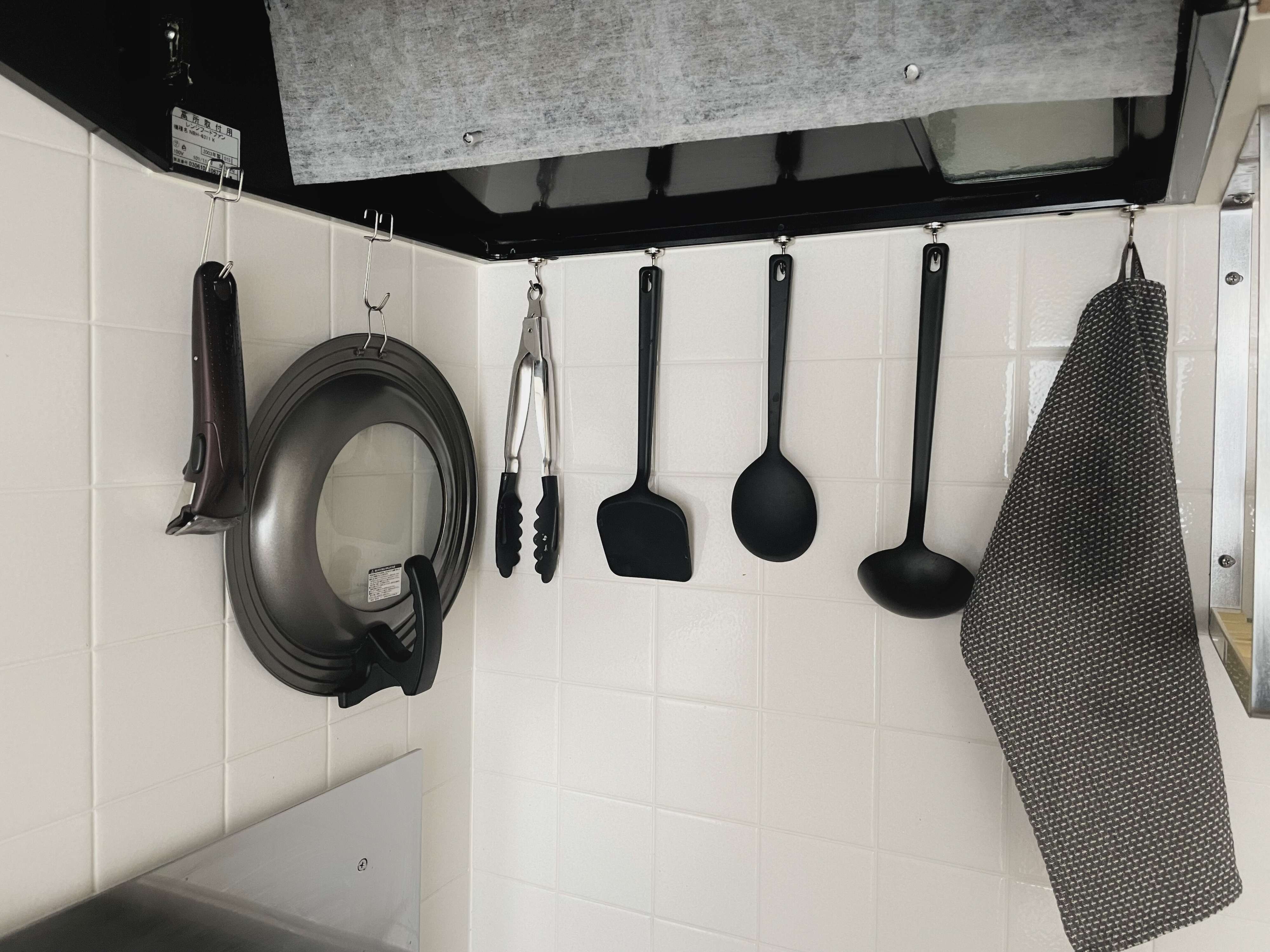 わが家のキッチンは、100均のマグネットフックを使って出番の多いキッチンツールを浮かせています。これで油跳ねは気にならないのに、使うときはサッと手に取れて掃除も楽になります。
