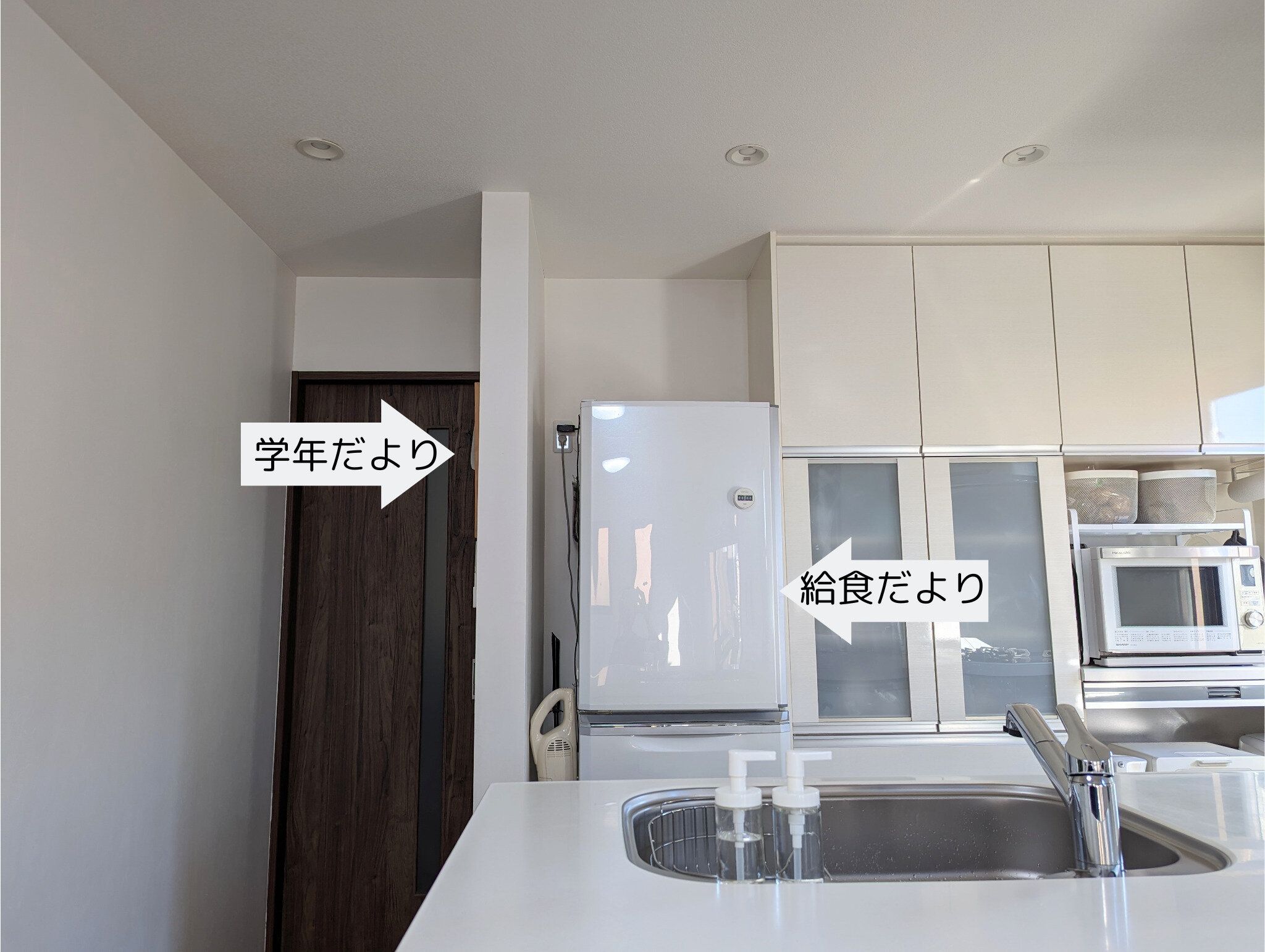 学年だよりは1.提出物と同じキッチン横のホワイトボード、給食だよりは冷蔵庫横が定位置。ここなら子どもたちも自分でチェックできるし、リビングからは見えにくい位置だから、ごちゃつきも気になりません。