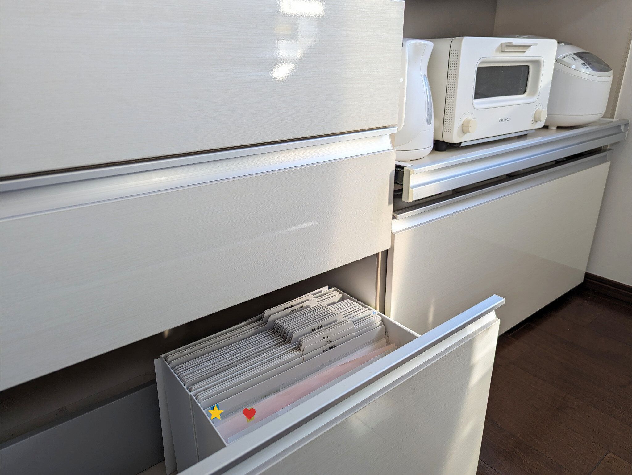 3.短期間保管と4.長期間保管のプリントは、食器棚の一番下の引き出しを指定席にしています。キッチンアイテムを入れるのが一般的な場所だけれど、