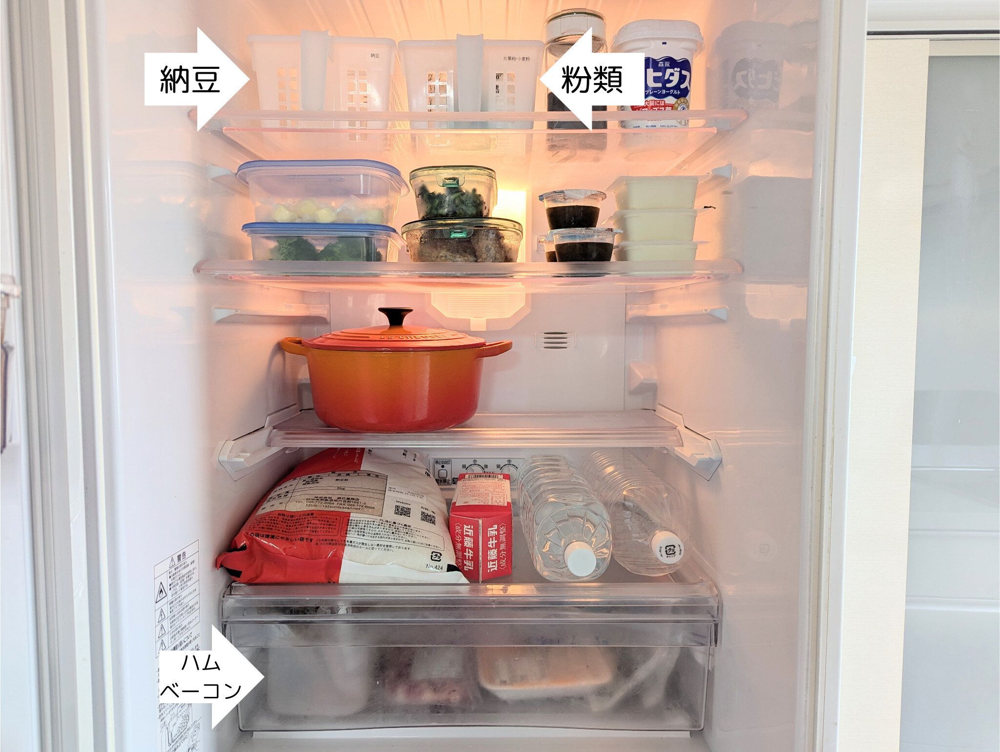 常にストックしていて、収納ケースに入れた方が出し入れしやすい納豆や粉類、ハム・ベーコンは、収納カゴを定位置にしているけれど、変動が激しいそのほかの食材はそのまま冷蔵庫へ。