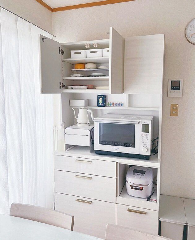 食器棚、家電は白で統一して、圧迫感を軽減。「棚や引き出しの中にしまう物は数を絞って、白い収納トレーで仕切りを。余白があるので、出し入れもラクです」。