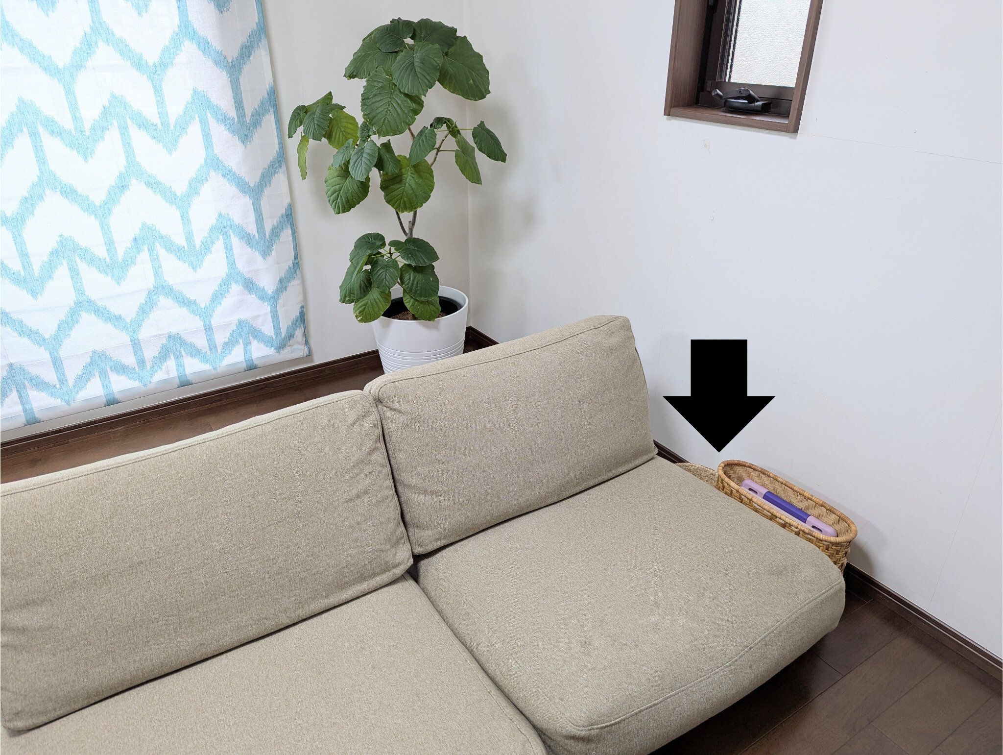 そこで早速、ソファ横にタブレット収納を設けました。活用したのは、自宅に余っていたカゴ(横37×縦25×マチ14cm)。タブレットが横にすっぽり収まる高さと、中で倒れない絶妙な幅で出し入れしやすく、子どもたちが自主的に片づける頻度がアップ。近くにコンセントの差し込み口があり、カゴに入れたまま充電できるのもポイントです。タブレットのメカっぽさを、天然素材が和らげてくれるのも◎