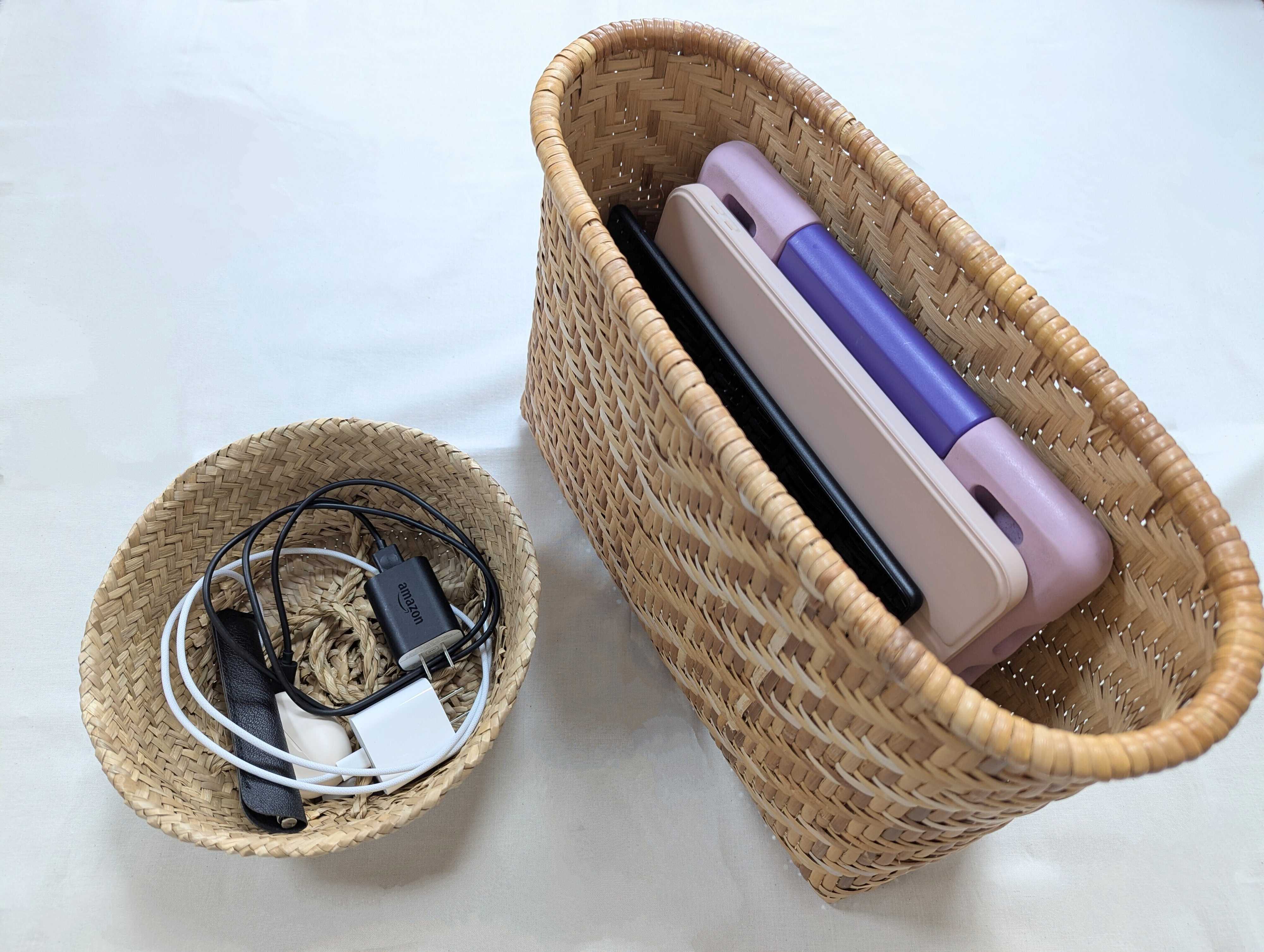 さらに、散らかりを防ぐためには、充電器やタッチペン、ワイヤレスイヤホンなどの周辺機器も近くに収納するのがベスト。これらはまとめてIKEAの人気アイテム「KRALLIG(クラッリグ)」に入れて、タブレットが入ったカゴの隣に置いています。