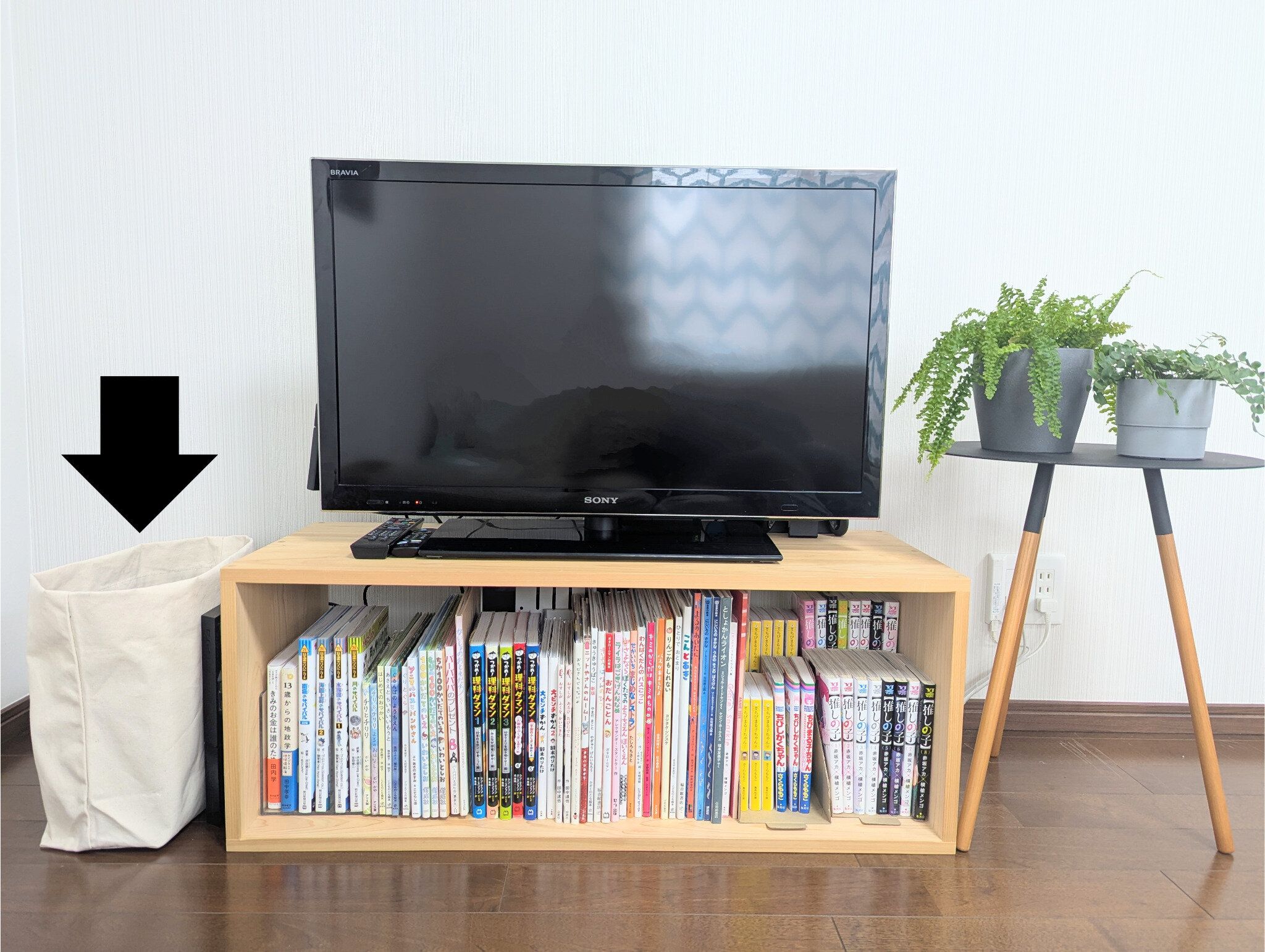 使っているのは、子どもが貸出カードをつくったときに図書館でもらったキャンバストート。市販品では、無印良品の「帆布 横型 トートバッグ(縦31×横46×マチ14cm)」(1,490円)がよく似たサイズ感です。このトートをリビングの絵本棚の横に置いて、図書館・図書室本の収納に。