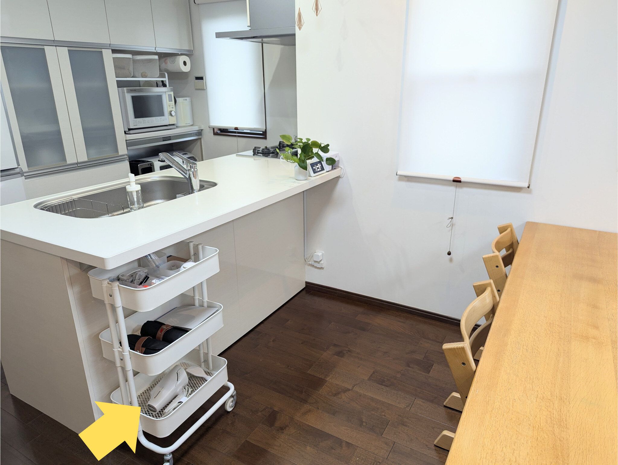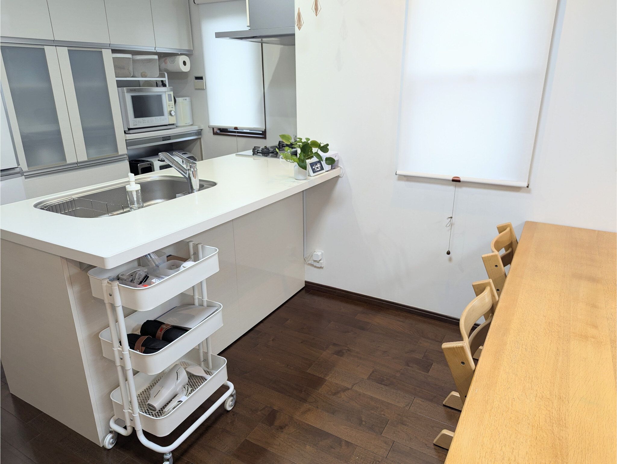 子ども関連の雑務はほとんどダイニングテーブルで行うので、ここにあれば、ワゴンを引き寄せるだけで書類作成を済ませられてとっても便利。