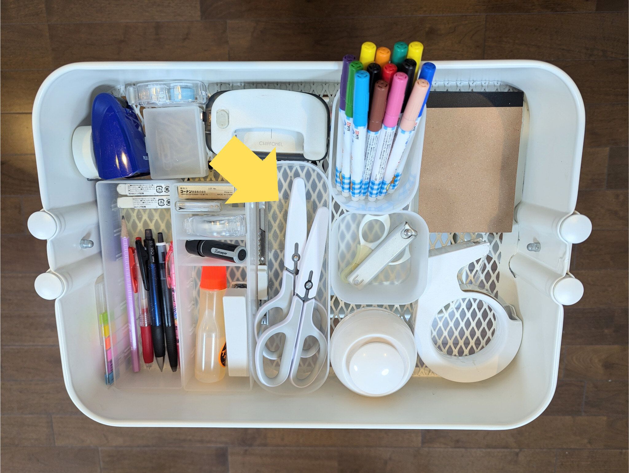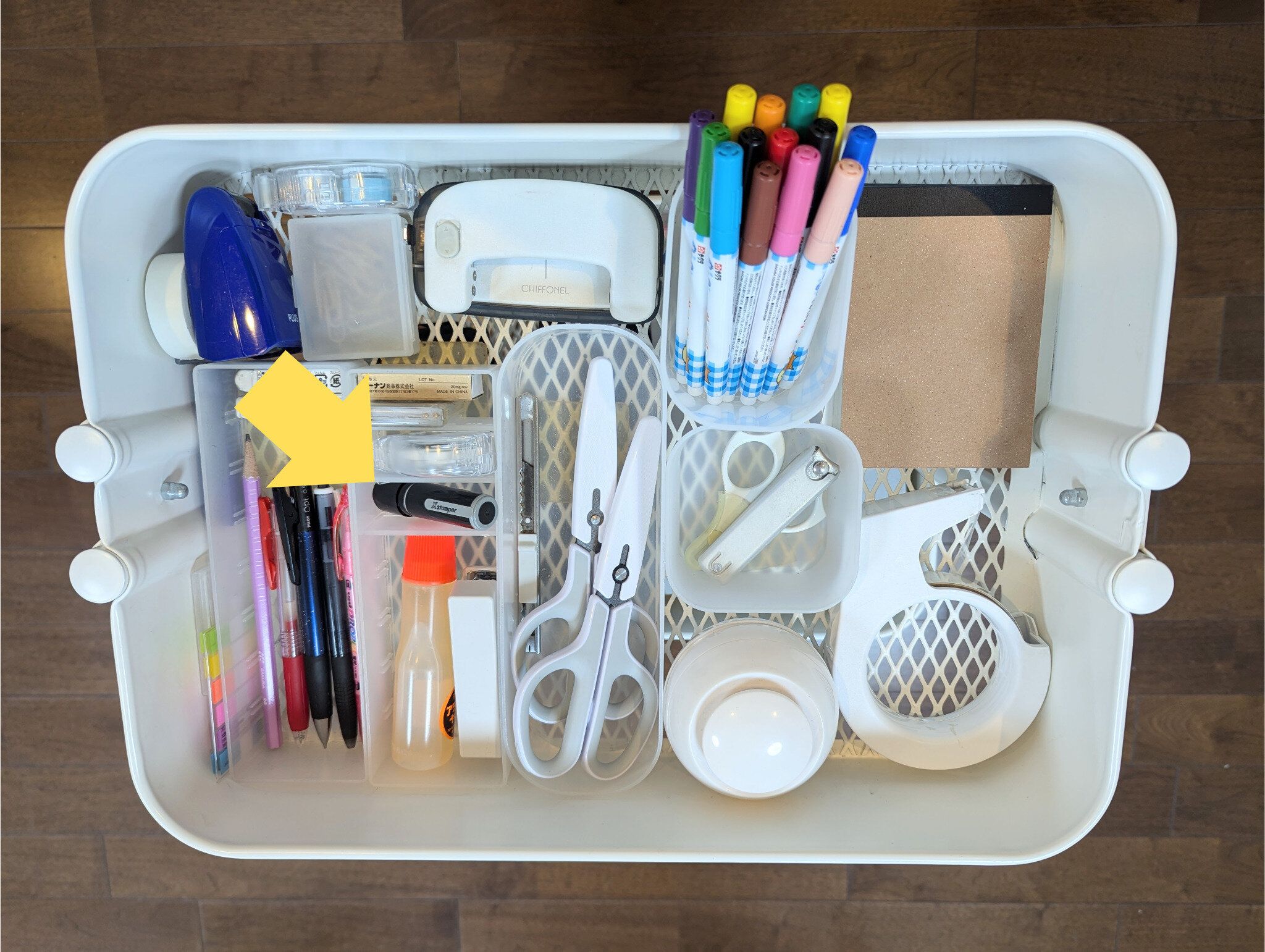 うち2本は、リビングのIKEAのワゴンに。娘たちは同時に工作をすることが多く、「ハサミ貸して!」「今使ってるから無理!」というやりとりからケンカが多発。そこから同じ場所に2本置くようになりました。