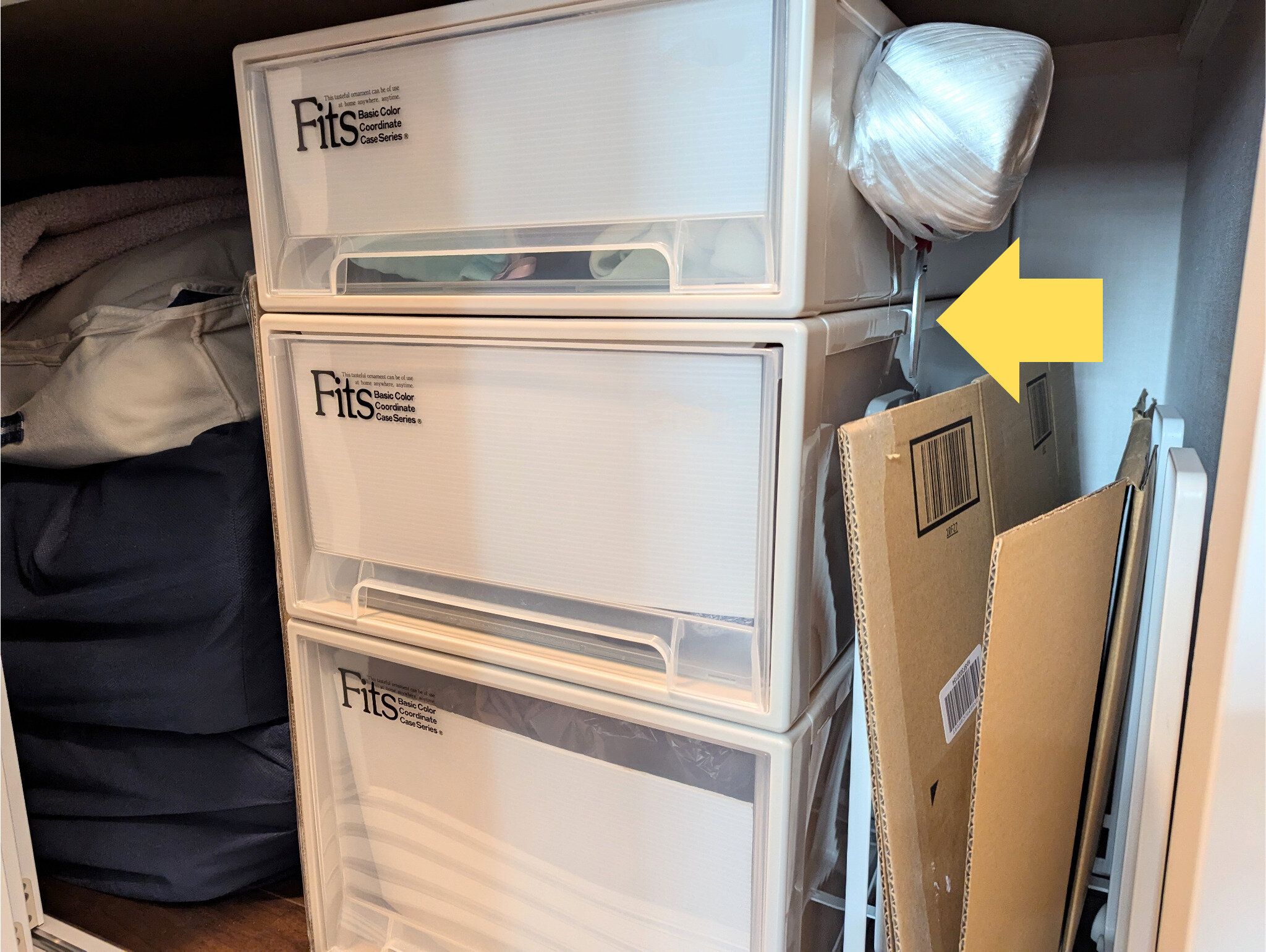 残り1本は、押し入れ内に常備。ビニールひもとセットで置いておき、資源ごみの回収日にダンボールをまとめるのに使います。億劫な家事も、必要な道具がすぐそばにあれば、とりかかる気になりやすいもの。