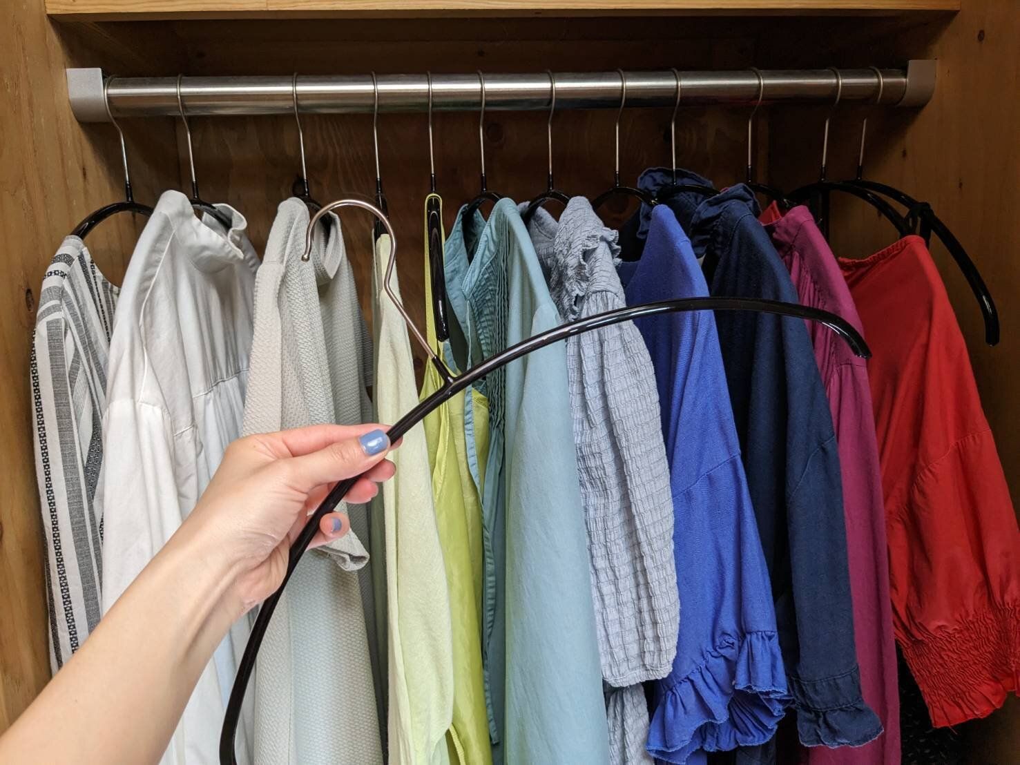 こうすることで自動的に、ハンガーの数以上の服を持てない仕組みができ上がりますよ。